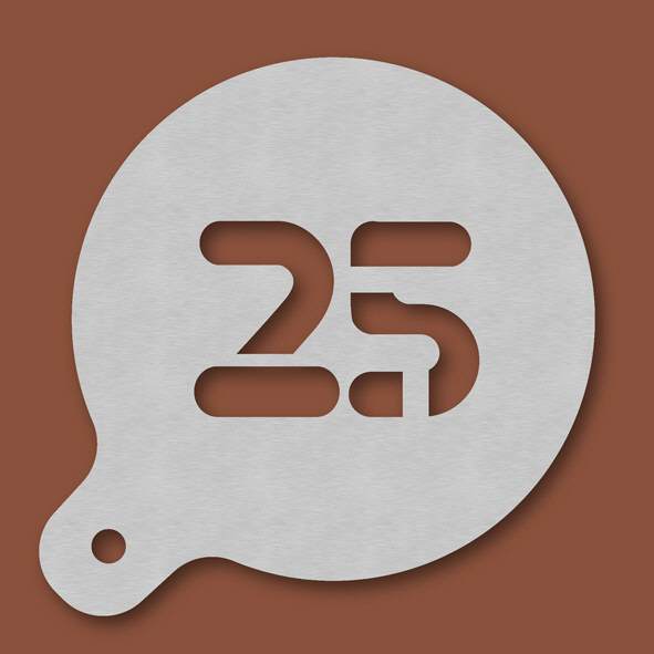 Cappuccino-Schablone Zahl 25, Außendurchmesser 120 mm, Schrifthöhe ca. 45 mm, aus Edelstahl mit Handgriff und integriertem Aufhänger, spülmaschinengeeignet, Lieferung in Verkaufsverpackung mit Kartone ...