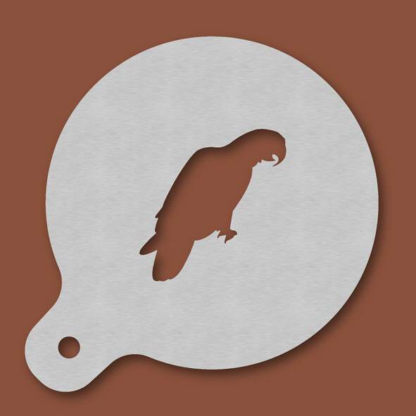 Cappuccino-Schablone Papagei, Außendurchmesser 120 mm, Motivdurchmesser ca. 70 mm, aus Edelstahl mit Handgriff und integriertem Aufhänger, spülmaschinengeeignet, Lieferung in Verkaufsverpackung mit Ka ...