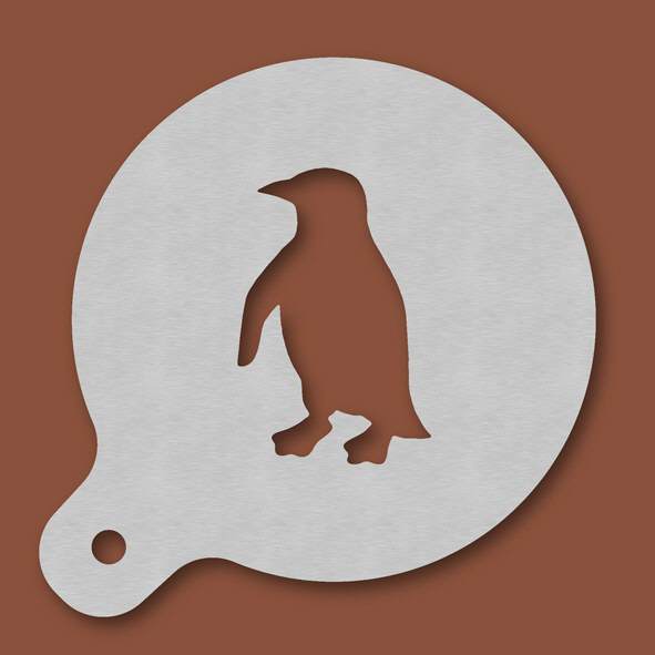 Cappuccino-Schablone Pinguin, Außendurchmesser 120 mm, Motivdurchmesser ca. 70 mm, aus Edelstahl mit Handgriff und integriertem Aufhänger, spülmaschinengeeignet, Lieferung in Verkaufsverpackung mit Ka ...