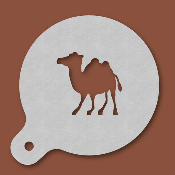 Cappuccino-Schablone Kamel, Außendurchmesser 120 mm, Motivdurchmesser ca. 70 mm, aus Edelstahl mit Handgriff und integriertem Aufhänger, spülmaschinengeeignet, Lieferung in Verkaufsverpackung mit Kart ...