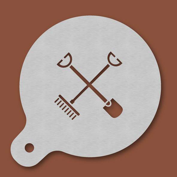 Cappuccino-Schablone Schaufel & Rechen, Außendurchmesser 120 mm, Motivdurchmesser ca. 70 mm, aus Edelstahl mit Handgriff und integriertem Aufhänger, spülmaschinengeeignet, Lieferung in Verkaufsverpack ...