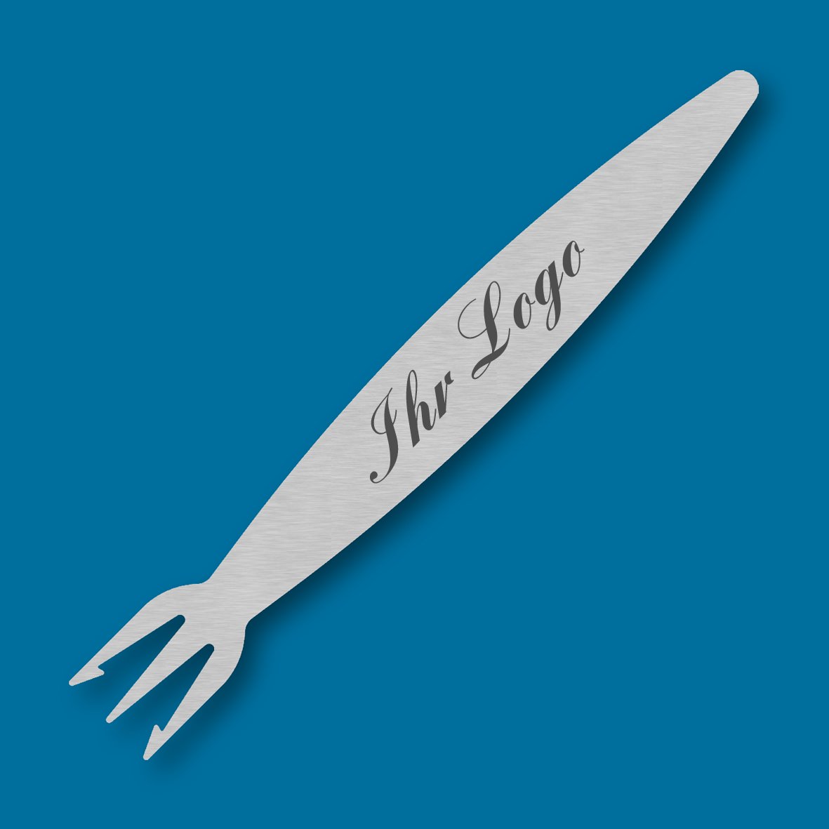 Pommesgabel / Käsespieß 01 aus Edelstahl, 100 x 12 x 1.5 mm, inklusive Logogravur (einseitig)