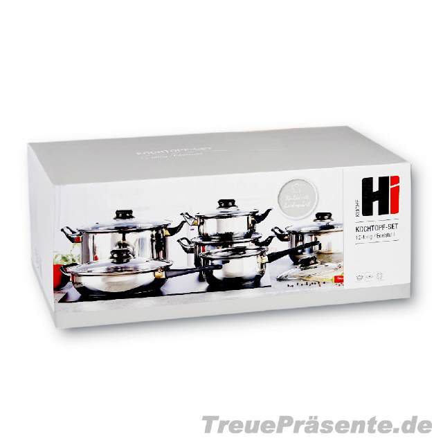 Kochtopf-Set 12-teilig, aus Edelstahl, inkl. vier Töpfen, einer Bratpfanne, einer Stielkasserolle und sechs Glas-Deckeln, geeignet für Elektro, Gas und Glaskeramik