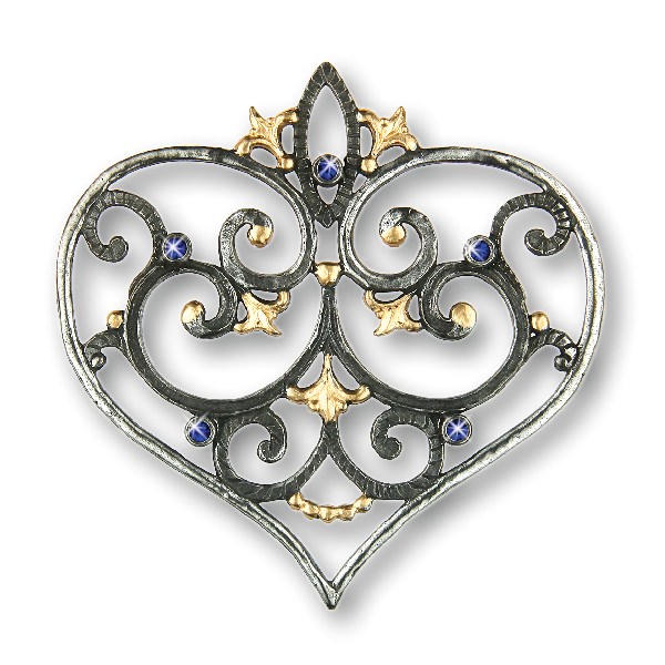 Zinnfigur Ranken-Herz mit 10 Steinen blau, doppelseitig, H: 8,5 cm, in Geschenkverpackung