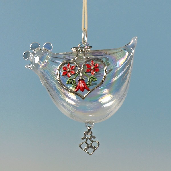 Glas-Henne mit Zinndekor rot, LxBxH: ca. 9,7 x 5,3 x 7,7 cm