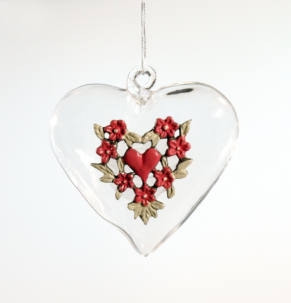 Glasherz klein mit Zinndekor Herz rosa, 5,1 x 5,3 x 1,8 cm