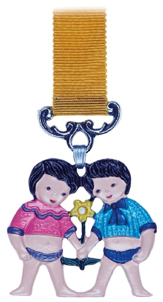 Lesezeichen Zwillinge, Zinn 93%, Band gelb, L: 33,0 cm