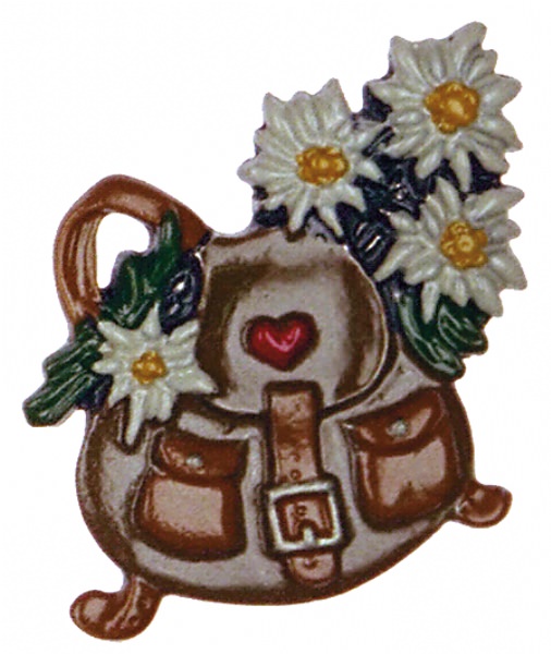 Magnet mit Zinnfigur Rucksack mit Edelweiß, H: 3,5 cm