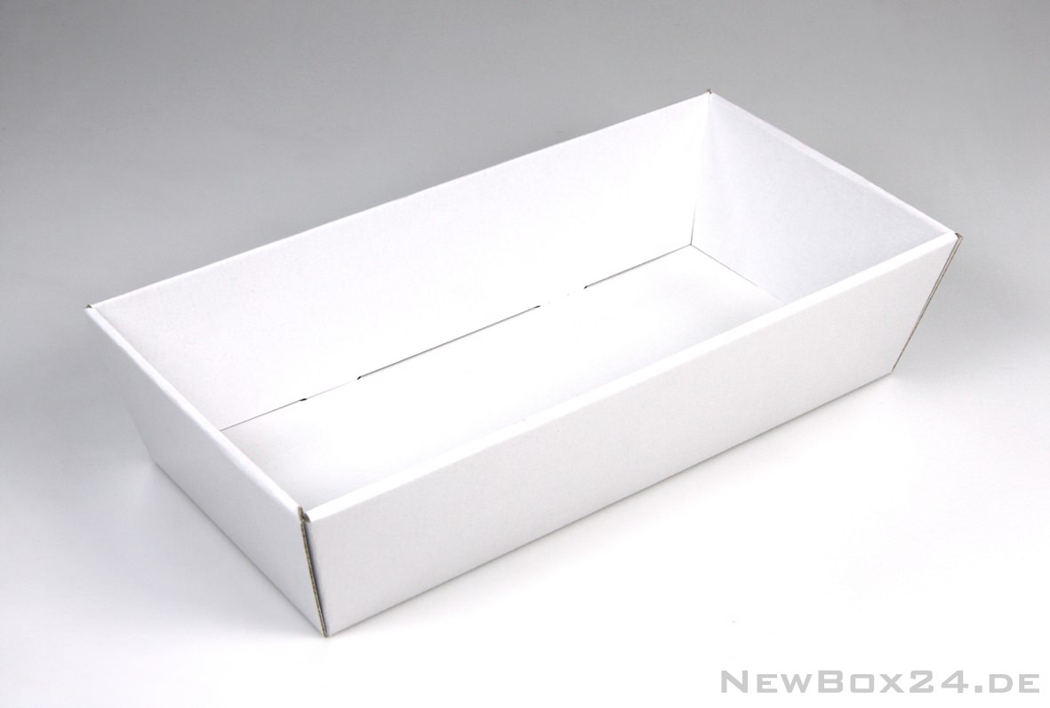 Geschenkkorb 634 Rechteck, 320 x 140 x 80 mm (LxBxH - Innenmaße Boden), Wellkarton glatt in Standardfarbe weiß (Farben gegen Aufpreis möglich), Lieferung ungefaltet