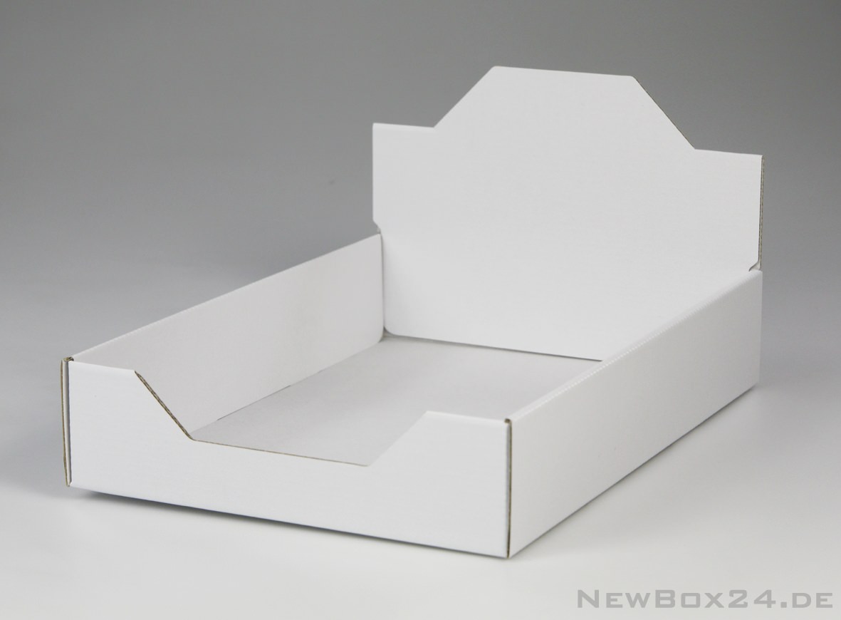 Display 653 in Größe 01 - 300 x 215 x 60 mm (Innenmaße - passend für DIN A4), Wellkarton glatt in Standardfarbe weiß (Farben gegen Aufpreis möglich), Lieferung ungefaltet