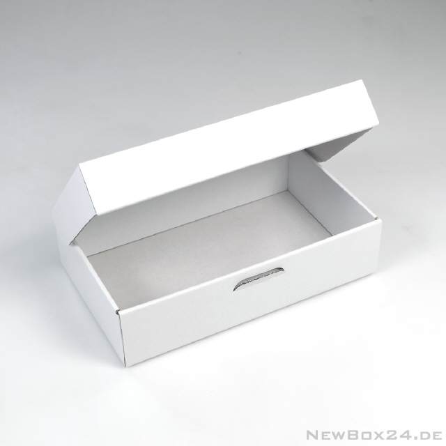 Klappdeckelbox 226 in Größe 01 - 240 x 160 x 60 mm (Innenmaße je Seite), Wellkarton glatt in Standardfarbe weiß (Farben gegen Aufpreis möglich), Lieferung ungefaltet