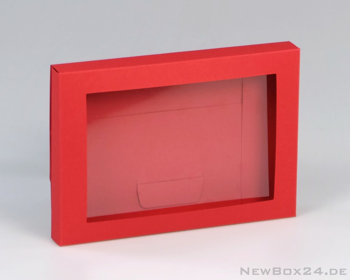 Postkartenverpackung, 164 x 116 x 18 mm (LxBxH) mit Fensterausschnitt und Klarsichtfolie, Karton in Standardfarbe nach Wahl (gold, silber, dekor gegen Aufpreis möglich), Lieferung ungefaltet, Klarsichteinlage separat