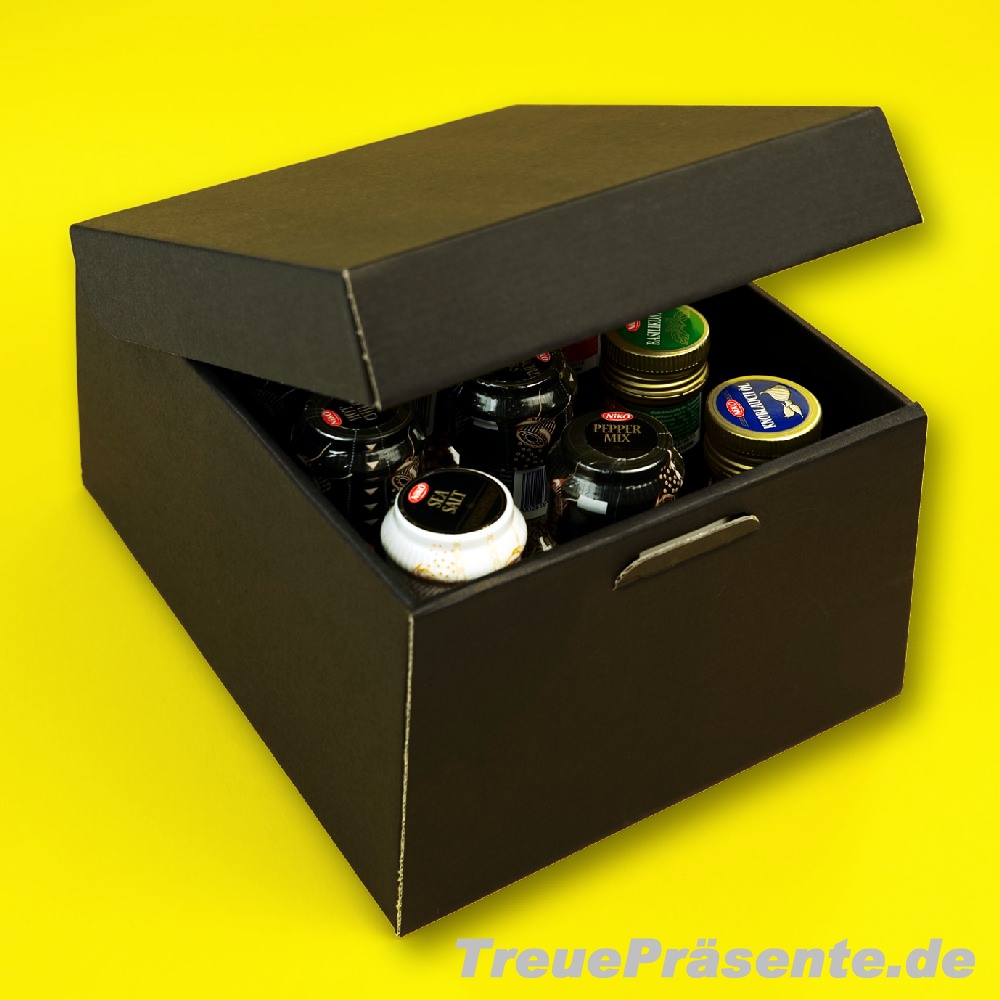 Geschenkset 12 Gewürze und Öle mit neun Gewürzmühlen, Pfeffer schwarz, Pfeffer bunt, Meersalz, Steinsalz, Curry, Chili, Kräuter der Provence, Pizza-Mix, Knoblauch-Salz, und drei Kräuterölen, Basilikum, Chili und Knoblauch, in einer exklusiven Geschenk-Box in Standardfarbe nach Wahl