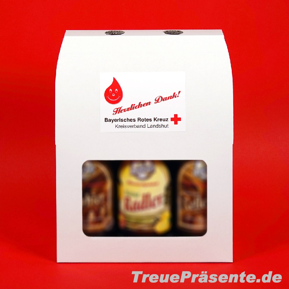 Geschenkverpackung Bierflaschen 3er-Set in Farbe weiß, passend für Standardflaschen 0.5 l mit Kronkorken oder Bügelverschluss, inkl. Aufkleber mit individuellem Druck (Ihr KV o. ä.), zzgl. Vorkosten Aufkleber 29,- Euro pro Auftrag, Lieferung ungefaltet und ohne Inhalt, Aufkleber beigelegt