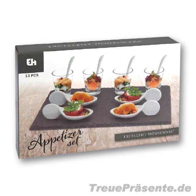 Vorspeisen-Set 13-teilig inkl. 4 Gläsern 4 Löffeln 4 Pfännchen (alle spülmaschinenfest) 1 Schieferplatte ca. 29,5 x 20 cm (nicht spülmaschinenfest)