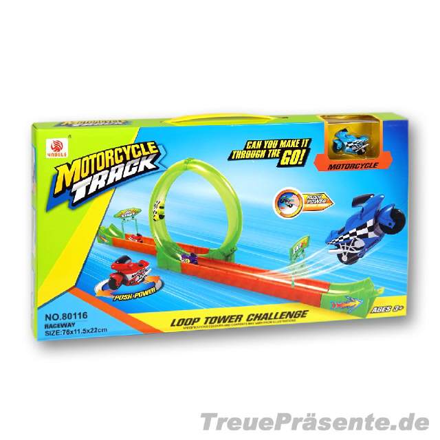 Motorrad-Rennbahn mit Zubehör, aufgebaut ca. 76 x 22 x 11,5 cm, farblich sortiert