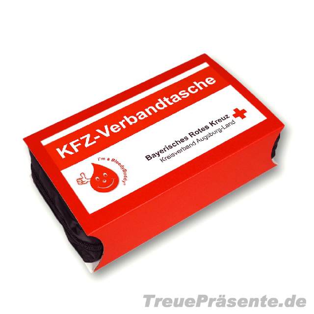Kraftfahrzeug-Verbandtasche nach DIN13164 inkl. Schiebehülle in rot und Aufkleber mit individuellem Druck (Ihr KV o. ä.), zzgl. Vorkosten Aufkleber 29,- Euro pro Auftrag, Lieferung komplett bestückt