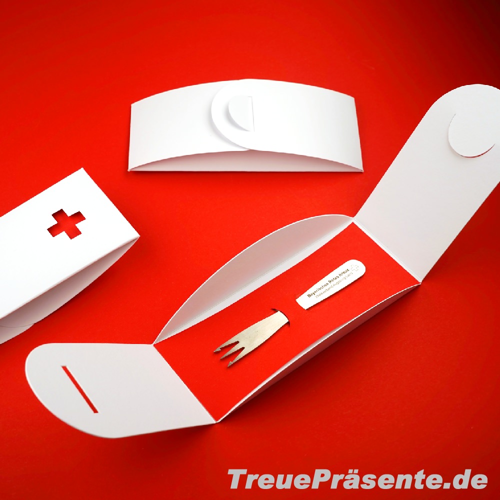 Pommesgabel inkl. individueller Lasergravur (Logo Ihres Kreisverbandes o. ä. - ohne Vorkosten!) in Geschenkverpackung 03 rot/00 reinweiß, inkl. Ausstanzung Kreuz