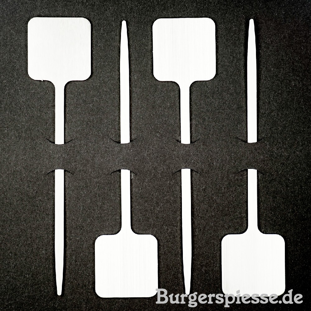 Burgerspieße 102 Quadrat 4er-Geschenkset inkl. Logogravur (einseitig) - 4 Hamburgerspieße aus Edelstahl, je ca. 155 x 35 x 1,5 mm, in Geschenk-Verpackung (Standard-Farbe nach Wahl)