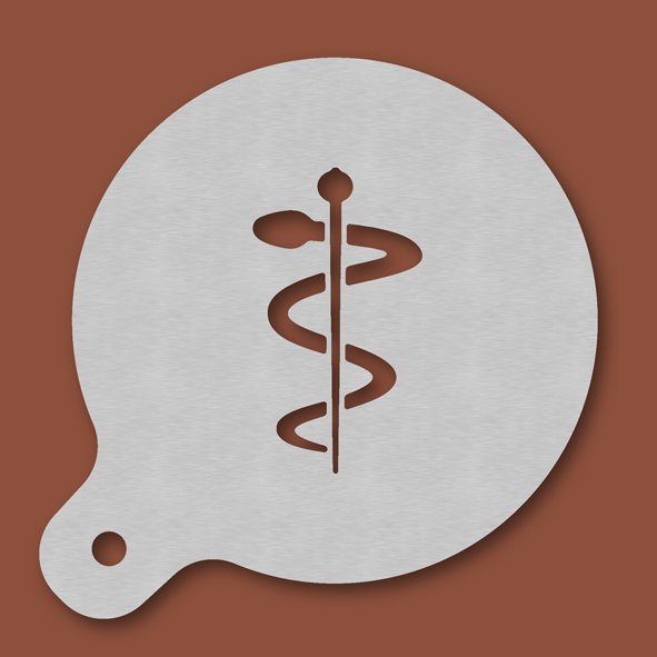 Cappuccino-Schablone Äskulapstab, Außendurchmesser 120 mm, Motivdurchmesser ca. 70 mm, aus Edelstahl mit Handgriff und integriertem Aufhänger, spülmaschinengeeignet, Lieferung in Verkaufsverpackung mit Kartoneinlage und Bedienungsanleitung