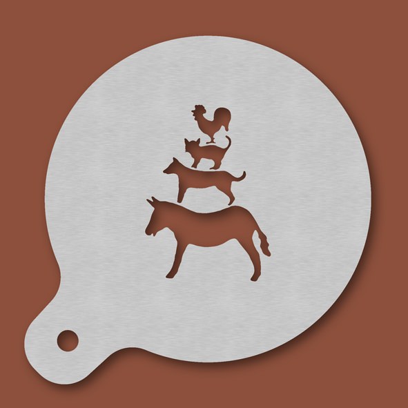 Cappuccino-Schablone Bremer Stadtmusikanten, Außendurchmesser 120 mm, Motivdurchmesser ca. 70 mm, aus Edelstahl mit Handgriff und integriertem Aufhänger, spülmaschinengeeignet, Lieferung in Verkaufsverpackung mit Kartoneinlage und Bedienungsanleitung
