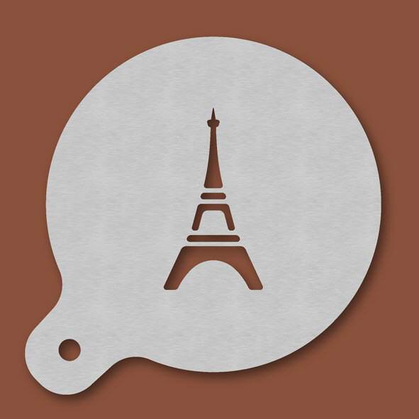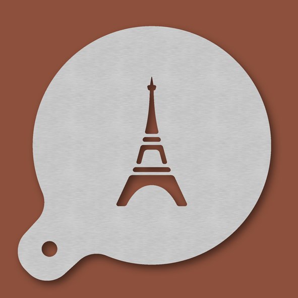 Cappuccino-Schablone Eiffelturm, Außendurchmesser 120 mm, Motivdurchmesser ca. 70 mm, aus Edelstahl mit Handgriff und integriertem Aufhänger, spülmaschinengeeignet, Lieferung in Verkaufsverpackung mit Kartoneinlage und Bedienungsanleitung