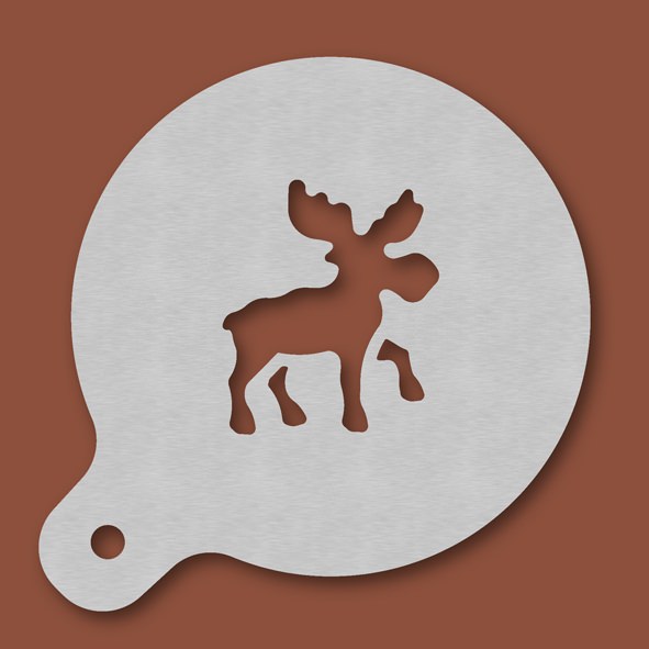 Cappuccino-Schablone Elch, Außendurchmesser 120 mm, Motivdurchmesser ca. 70 mm, aus Edelstahl mit Handgriff und integriertem Aufhänger, spülmaschinengeeignet, Lieferung in Verkaufsverpackung mit Kartoneinlage und Bedienungsanleitung