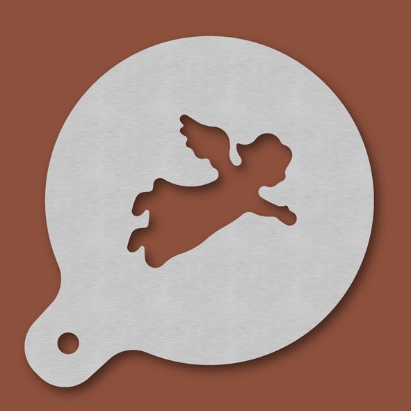 Cappuccino-Schablone Engel fliegend, Außendurchmesser 120 mm, Motivdurchmesser ca. 70 mm, aus Edelstahl mit Handgriff und integriertem Aufhänger, spülmaschinengeeignet, Lieferung in Verkaufsverpackung mit Kartoneinlage und Bedienungsanleitung