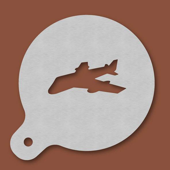Cappuccino-Schablone Flugzeug, Außendurchmesser 120 mm, Motivdurchmesser ca. 70 mm, aus Edelstahl mit Handgriff und integriertem Aufhänger, spülmaschinengeeignet, Lieferung in Verkaufsverpackung mit Kartoneinlage und Bedienungsanleitung