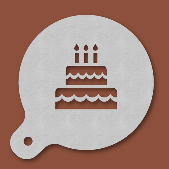 Cappuccino-Schablone Geburtstagstorte, Außendurchmesser 120 mm, Motivdurchmesser ca. 70 mm, aus Edelstahl mit Handgriff und integriertem Aufhänger, spülmaschinengeeignet, Lieferung in Verkaufsverpackung mit Kartoneinlage und Bedienungsanleitung