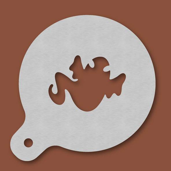 Cappuccino-Schablone Geist, Außendurchmesser 120 mm, Motivdurchmesser ca. 70 mm, aus Edelstahl mit Handgriff und integriertem Aufhänger, spülmaschinengeeignet, Lieferung in Verkaufsverpackung mit Kartoneinlage und Bedienungsanleitung