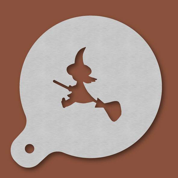 Cappuccino-Schablone Junge Hexe, Außendurchmesser 120 mm, Motivdurchmesser ca. 70 mm, aus Edelstahl mit Handgriff und integriertem Aufhänger, spülmaschinengeeignet, Lieferung in Verkaufsverpackung mit Kartoneinlage und Bedienungsanleitung