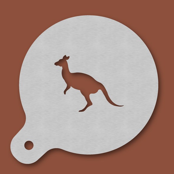 Cappuccino-Schablone Känguru, Außendurchmesser 120 mm, Motivdurchmesser ca. 70 mm, aus Edelstahl mit Handgriff und integriertem Aufhänger, spülmaschinengeeignet, Lieferung in Verkaufsverpackung mit Kartoneinlage und Bedienungsanleitung