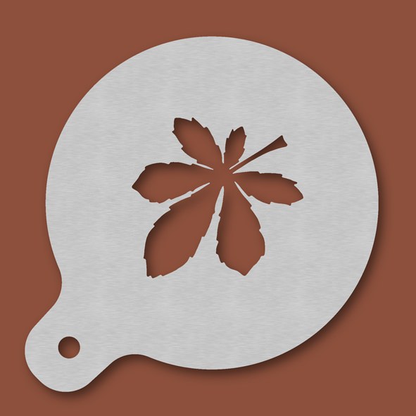Cappuccino-Schablone Kastanienblatt, Außendurchmesser 120 mm, Motivdurchmesser ca. 70 mm, aus Edelstahl mit Handgriff und integriertem Aufhänger, spülmaschinengeeignet, Lieferung in Verkaufsverpackung mit Kartoneinlage und Bedienungsanleitung