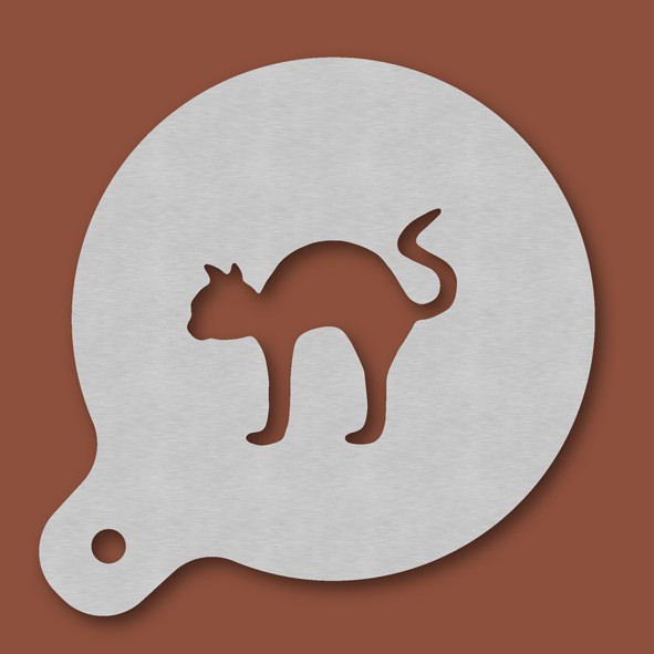Cappuccino-Schablone Katze mit Buckel, Außendurchmesser 120 mm, Motivdurchmesser ca. 70 mm, aus Edelstahl mit Handgriff und integriertem Aufhänger, spülmaschinengeeignet, Lieferung in Verkaufsverpackung mit Kartoneinlage und Bedienungsanleitung