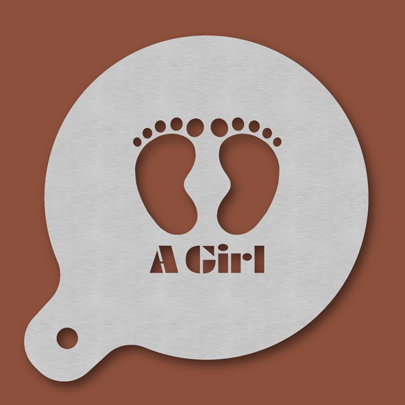Cappuccino-Schablone Kinderfüße - A Girl, Außendurchmesser 120 mm, Motivdurchmesser ca. 70 mm, aus Edelstahl mit Handgriff und integriertem Aufhänger, spülmaschinengeeignet, Lieferung in Verkaufsverpackung mit Kartoneinlage und Bedienungsanleitung