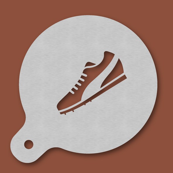 Cappuccino-Schablone Laufschuh, Außendurchmesser 120 mm, Motivdurchmesser ca. 70 mm, aus Edelstahl mit Handgriff und integriertem Aufhänger, spülmaschinengeeignet, Lieferung in Verkaufsverpackung mit Kartoneinlage und Bedienungsanleitung