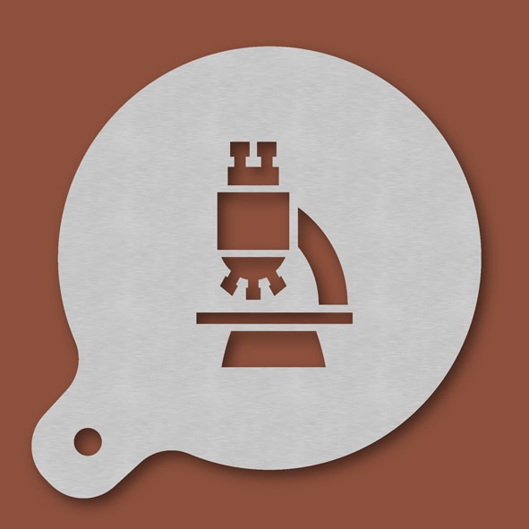 Cappuccino-Schablone Mikroskop, Außendurchmesser 120 mm, Motivdurchmesser ca. 70 mm, aus Edelstahl mit Handgriff und integriertem Aufhänger, spülmaschinengeeignet, Lieferung in Verkaufsverpackung mit Kartoneinlage und Bedienungsanleitung