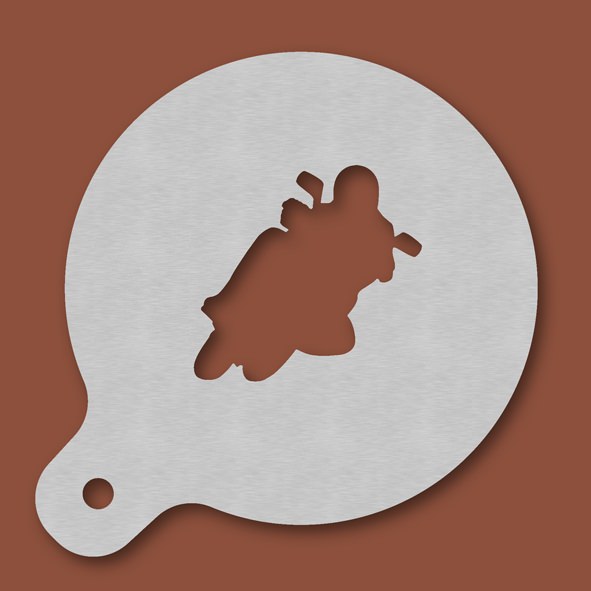 Cappuccino-Schablone Motorradfahrer, Außendurchmesser 120 mm, Motivdurchmesser ca. 70 mm, aus Edelstahl mit Handgriff und integriertem Aufhänger, spülmaschinengeeignet, Lieferung in Verkaufsverpackung mit Kartoneinlage und Bedienungsanleitung