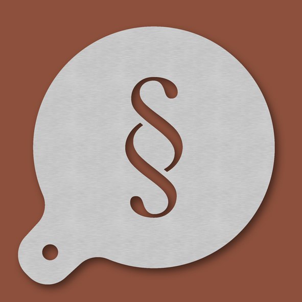 Cappuccino-Schablone Paragraf, Außendurchmesser 120 mm, Motivdurchmesser ca. 70 mm, aus Edelstahl mit Handgriff und integriertem Aufhänger, spülmaschinengeeignet, Lieferung in Verkaufsverpackung mit Kartoneinlage und Bedienungsanleitung