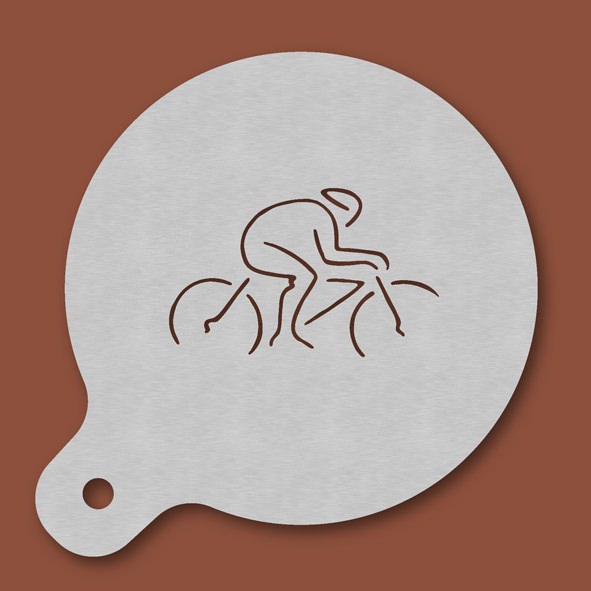 Cappuccino-Schablone Radrennfahrer, Außendurchmesser 120 mm, Motivdurchmesser ca. 70 mm, aus Edelstahl mit Handgriff und integriertem Aufhänger, spülmaschinengeeignet, Lieferung in Verkaufsverpackung mit Kartoneinlage und Bedienungsanleitung