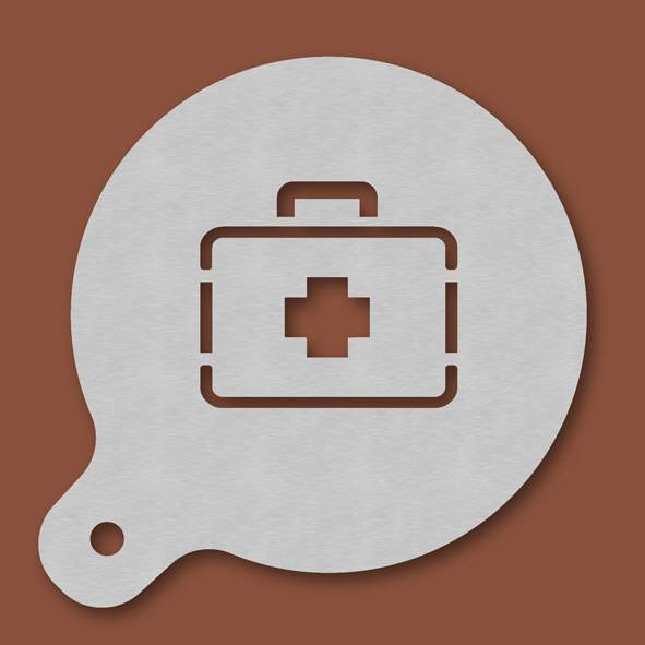 Cappuccino-Schablone Sanitäter, Außendurchmesser 120 mm, Motivdurchmesser ca. 70 mm, aus Edelstahl mit Handgriff und integriertem Aufhänger, spülmaschinengeeignet, Lieferung in Verkaufsverpackung mit Kartoneinlage und Bedienungsanleitung