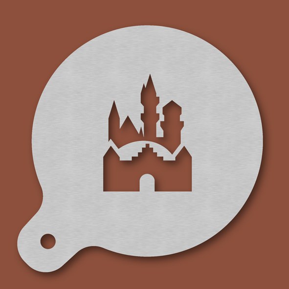 Cappuccino-Schablone Schloss Neuschwanstein, Außendurchmesser 120 mm, Motivdurchmesser ca. 70 mm, aus Edelstahl mit Handgriff und integriertem Aufhänger, spülmaschinengeeignet, Lieferung in Verkaufsverpackung mit Kartoneinlage und Bedienungsanleitung