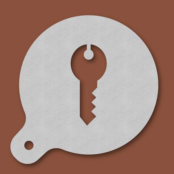 Cappuccino-Schablone Schlüssel, Außendurchmesser 120 mm, Motivdurchmesser ca. 70 mm, aus Edelstahl mit Handgriff und integriertem Aufhänger, spülmaschinengeeignet, Lieferung in Verkaufsverpackung mit Kartoneinlage und Bedienungsanleitung