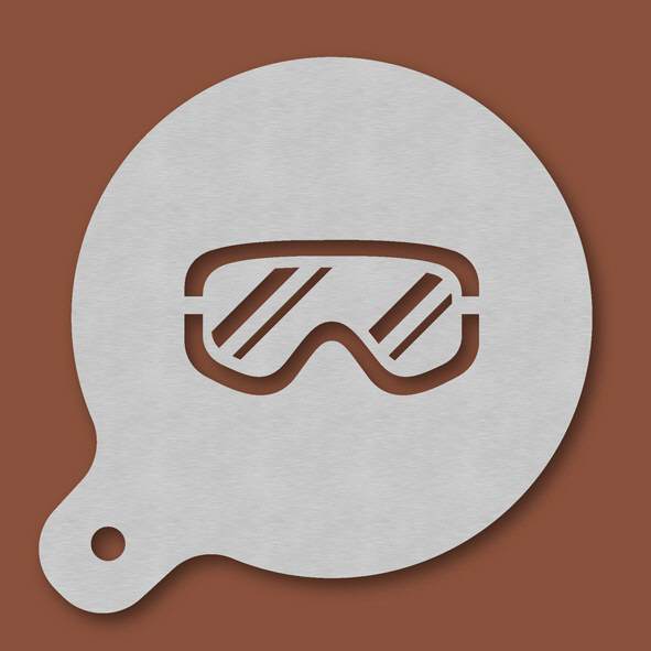 Cappuccino-Schablone Skibrille, Außendurchmesser 120 mm, Motivdurchmesser ca. 70 mm, aus Edelstahl mit Handgriff und integriertem Aufhänger, spülmaschinengeeignet, Lieferung in Verkaufsverpackung mit Kartoneinlage und Bedienungsanleitung