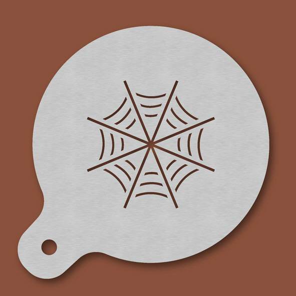 Cappuccino-Schablone Spinnennetz, Außendurchmesser 120 mm, Motivdurchmesser ca. 70 mm, aus Edelstahl mit Handgriff und integriertem Aufhänger, spülmaschinengeeignet, Lieferung in Verkaufsverpackung mit Kartoneinlage und Bedienungsanleitung