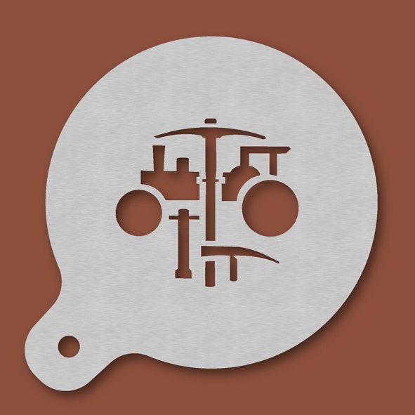 Cappuccino-Schablone Straßenbauer, Außendurchmesser 120 mm, Motivdurchmesser ca. 70 mm, aus Edelstahl mit Handgriff und integriertem Aufhänger, spülmaschinengeeignet, Lieferung in Verkaufsverpackung mit Kartoneinlage und Bedienungsanleitung
