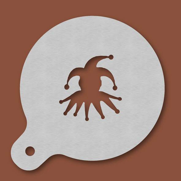 Cappuccino-Schablone Till Eulenspiegel, Außendurchmesser 120 mm, Motivdurchmesser ca. 70 mm, aus Edelstahl mit Handgriff und integriertem Aufhänger, spülmaschinengeeignet, Lieferung in Verkaufsverpackung mit Kartoneinlage und Bedienungsanleitung