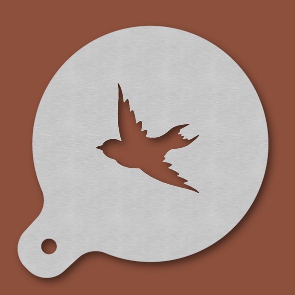 Cappuccino-Schablone Vogel, Außendurchmesser 120 mm, Motivdurchmesser ca. 70 mm, aus Edelstahl mit Handgriff und integriertem Aufhänger, spülmaschinengeeignet, Lieferung in Verkaufsverpackung mit Kartoneinlage und Bedienungsanleitung