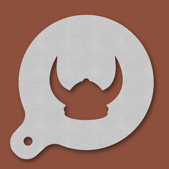 Cappuccino-Schablone Wikingerhelm, Außendurchmesser 120 mm, Motivdurchmesser ca. 70 mm, aus Edelstahl mit Handgriff und integriertem Aufhänger, spülmaschinengeeignet, Lieferung in Verkaufsverpackung mit Kartoneinlage und Bedienungsanleitung
